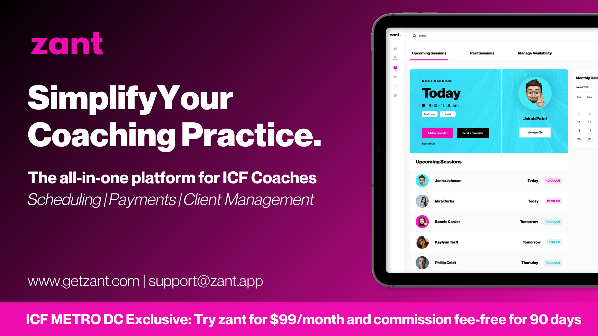 Join us for an exclusive session with our strategic partner, Zant, to learn how Zant is empowering coaches to streamline their practices, expand their reach, and amplify their impact. They’ll share how Zant’s all-in-one platform simplifies scheduling, payments, and client management, while providing marketing and visibility tools to help ICF coaches grow. This webinar will also highlight the collaboration with ICF Metro DC and the unique opportunities available for its members.