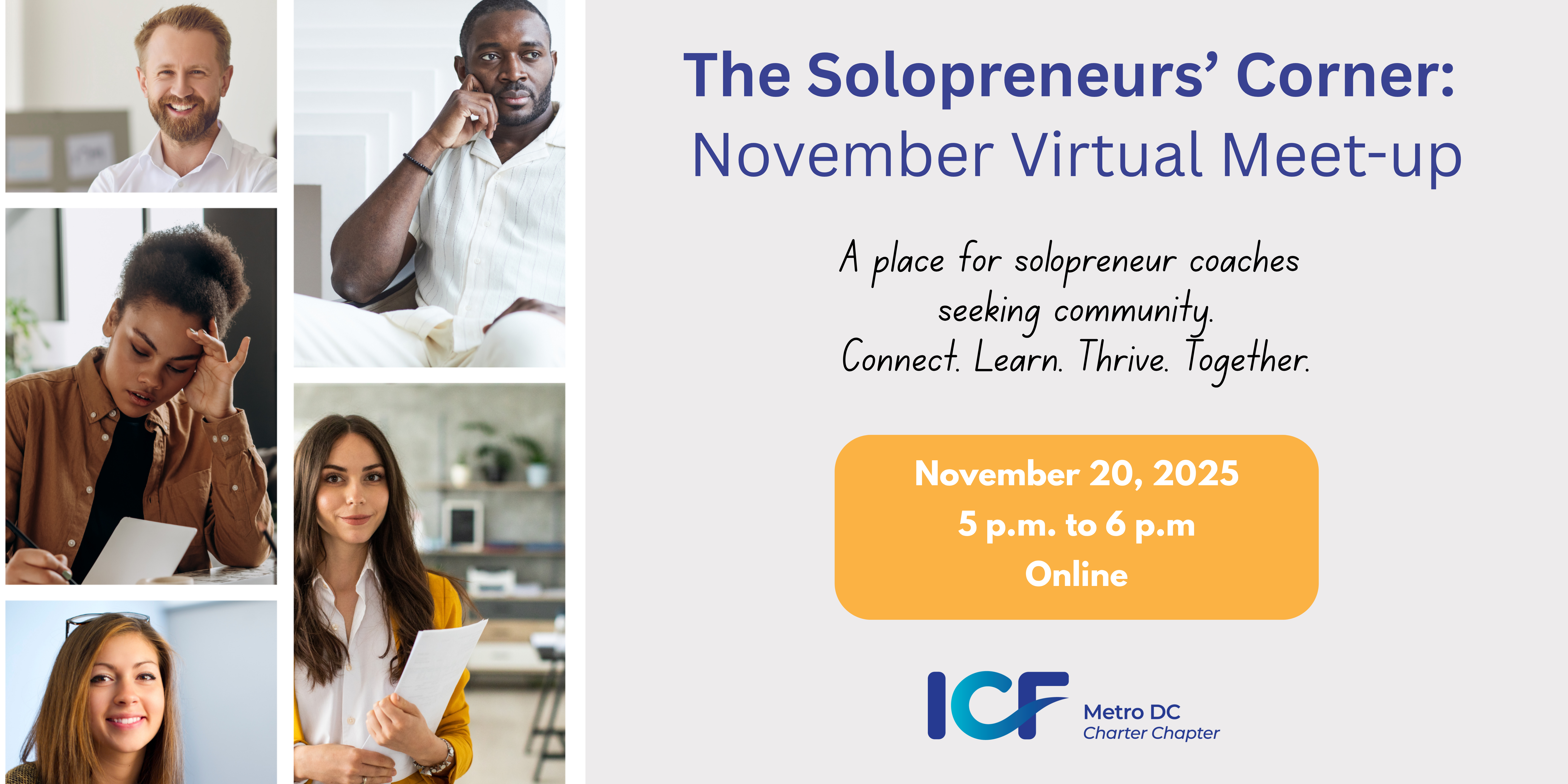 Solopreneurship can be lonely, but community can transform it to being energizing and joyful. Are you a solopreneur ICF Coach in the DMV area looking for a space to connect, collaborate, and grow? Welcome to The Solopreneurs' Corner at the ICF DC Metro Chapter! Whether you're just starting out or scaling your business, this is the place for support, inspiration, and practical strategies.